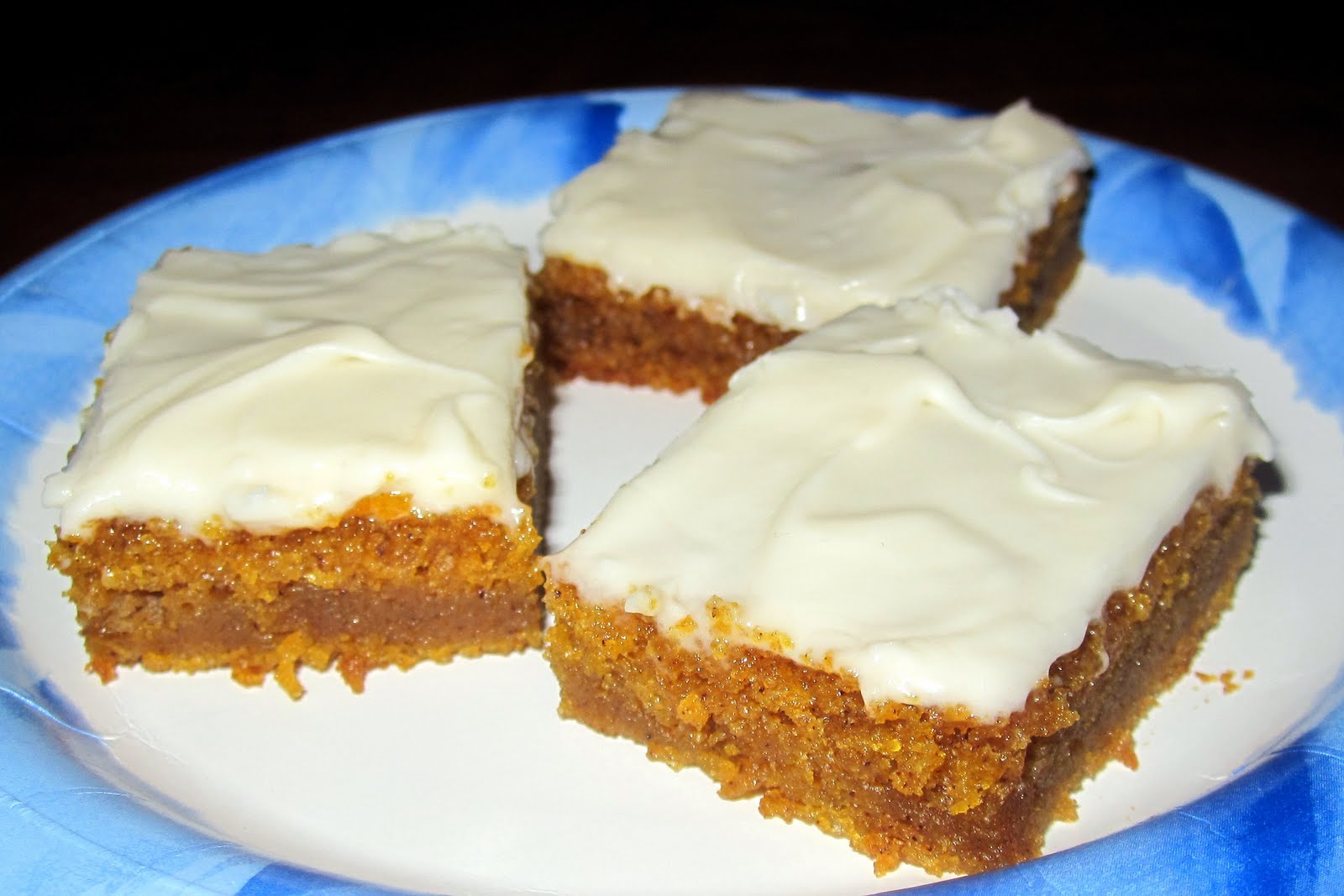 These bars are a moist cake, not too tall, though I suppose if you baked them in a smaller pan for a little longer, you could have taller bars. The cream cheese frosting is a nice addition. I don't normally make cream cheese frosting because it's fattening, but it was such a thin layer spread on the bars that I was willing, and it really did make a difference. I served these at a potluck dinner, and then brought the leftovers to work. They were a hit with everyone!